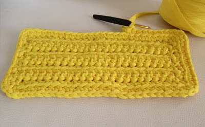 N początek robimy spód torebki, tworząc prostokąt o wymiarach ok 25 na 10 cm. Nasza torebka ma prosty wzór - jeden rząd słupków, drugi rząd oczka ścisłe i tak na zmianę.