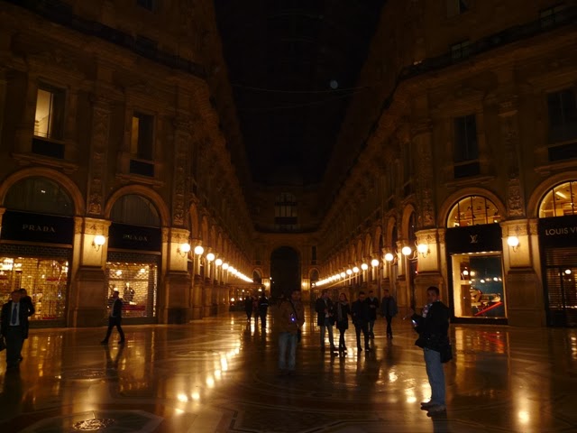 Zdjęcia nocne niestety nie oddadzą rzeczywistości tak dokładnie. Obok Duomo znajduje się symbol bogactwa i elegancji miasta - XIX wieczna Galeria Vittorio Emanuele II. Ciekawostką jest to, że w centralnym punkcie jej mozaikowej posadzki znajduje się wizerunek byka. Ludzie wierzą, że obrót na pięcie o 360 stopni w miejscu genitaliów przyniesie szczęście na całe życie...! Szczerzę mówiąc byłam tak zafascynowana witrynami z napisem Prada czy Louis Vuitton, że zapomniała o zagarnięciu choć troszeczkę szczęścia dla siebie. Choć myślę, że akurat ja mam go wystarczająco. Już sama obecność tam jest tego dowodem...