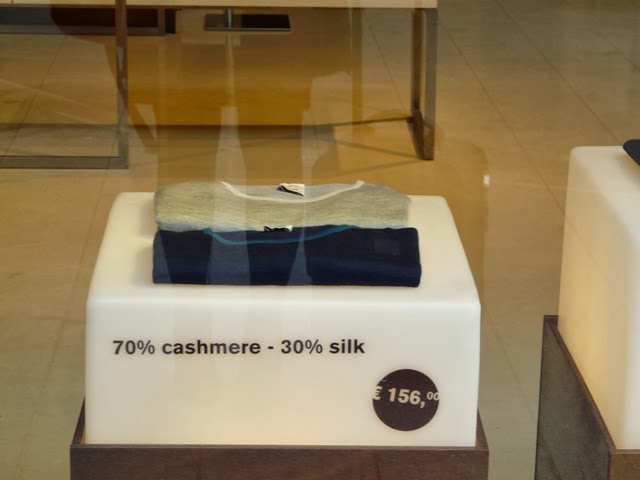 | Witryny sklepowe z ekspozycją informującą o składzie surowcowym dzianin to częste zjawisko w Mediolanie |