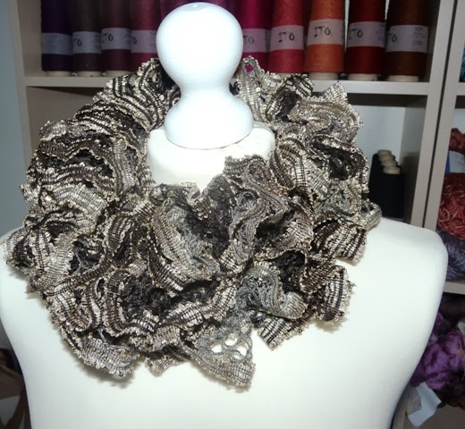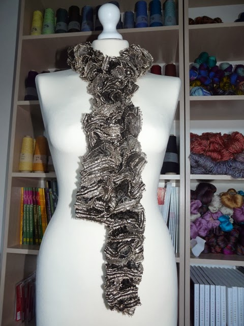 Dużymi krokami, zbliżają się święta, a wraz z nimi okres hucznych zabaw i swawoli... Na okres Bożego Narodzenia przydadzą się prezenty, oczywiście ręcznie robione, zaś na ten drugi okres niezbędne będą dziergane stroje lub dodatki do tychże stroi. Właśnie na taką okazję udało mi się coś stworzyć. Nie każdemu będzie taki akcent odpowiadać ale pewnie niejedna dziewczyna chętnie ozdobi swoją małą czarną takim szalem. Włóczka sama w sobie jest dosyć strojna więc będzie idealnie pasować do prostej i najlepiej jednokolorowej kreacji...