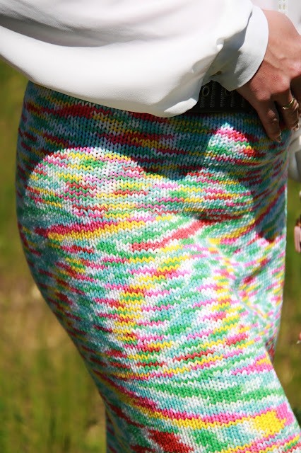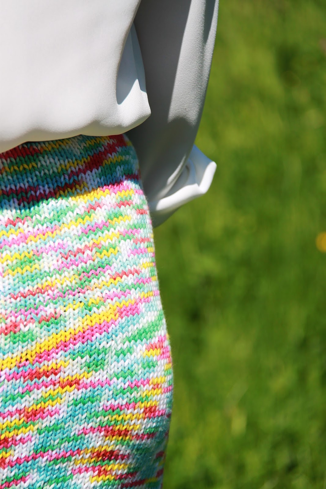 Druty wybrałam 3,5 mm dlatego, żeby dzianina była jak najmniej narażona na zmianę formy. Do końca jednak nie uniknęłam tego problemu, troszkę się naciągnęła tu i tam... w końcu to jest spódnica, siadamy, chodzimy, kręcimy pupą ;-)