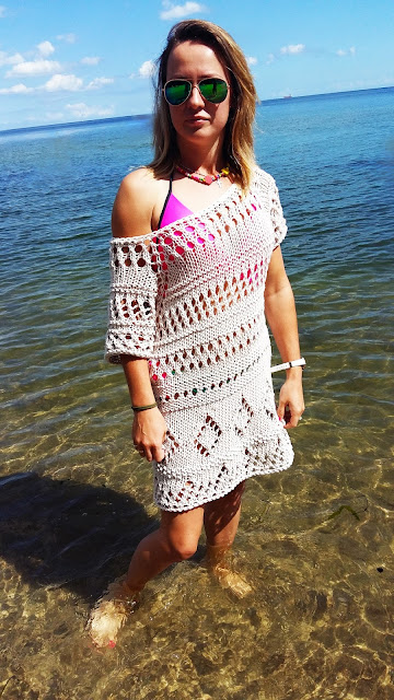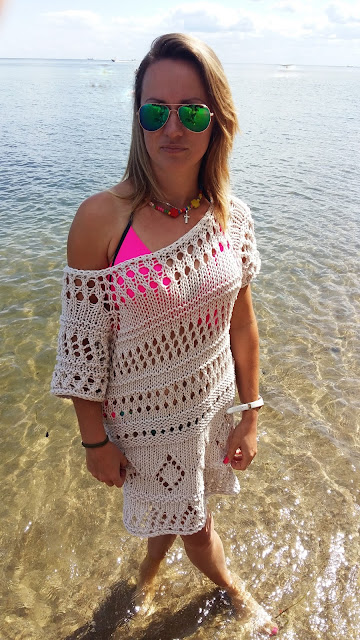 Na moja tunikę zużyłam 5 motków, a dziergałam na drutach nr 8 mm. W sumie, to jakiś tydzień przed urlopem wpadłam na pomysł zrobienia sobie tuniki czy raczej czegoś takiego, co można założyć na strój kąpielowy i co nieco zasłonić .... Tak więc zasiadłam do robótki. Pomysł na wzór to jak zwykle improwizacja, która i tym razem mnie nie zawiodła.... Kłębek za kłębkiem i tak przez dwa dni, bo własnie tyle czasu zajęło mi stworzenie tej dzianiny.