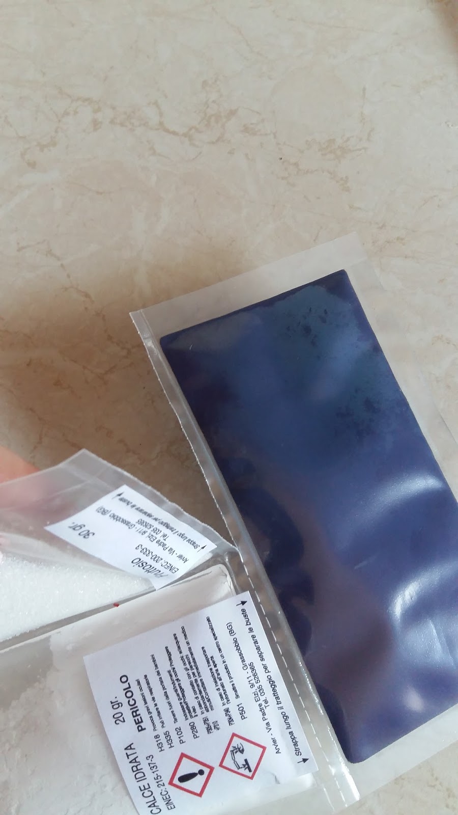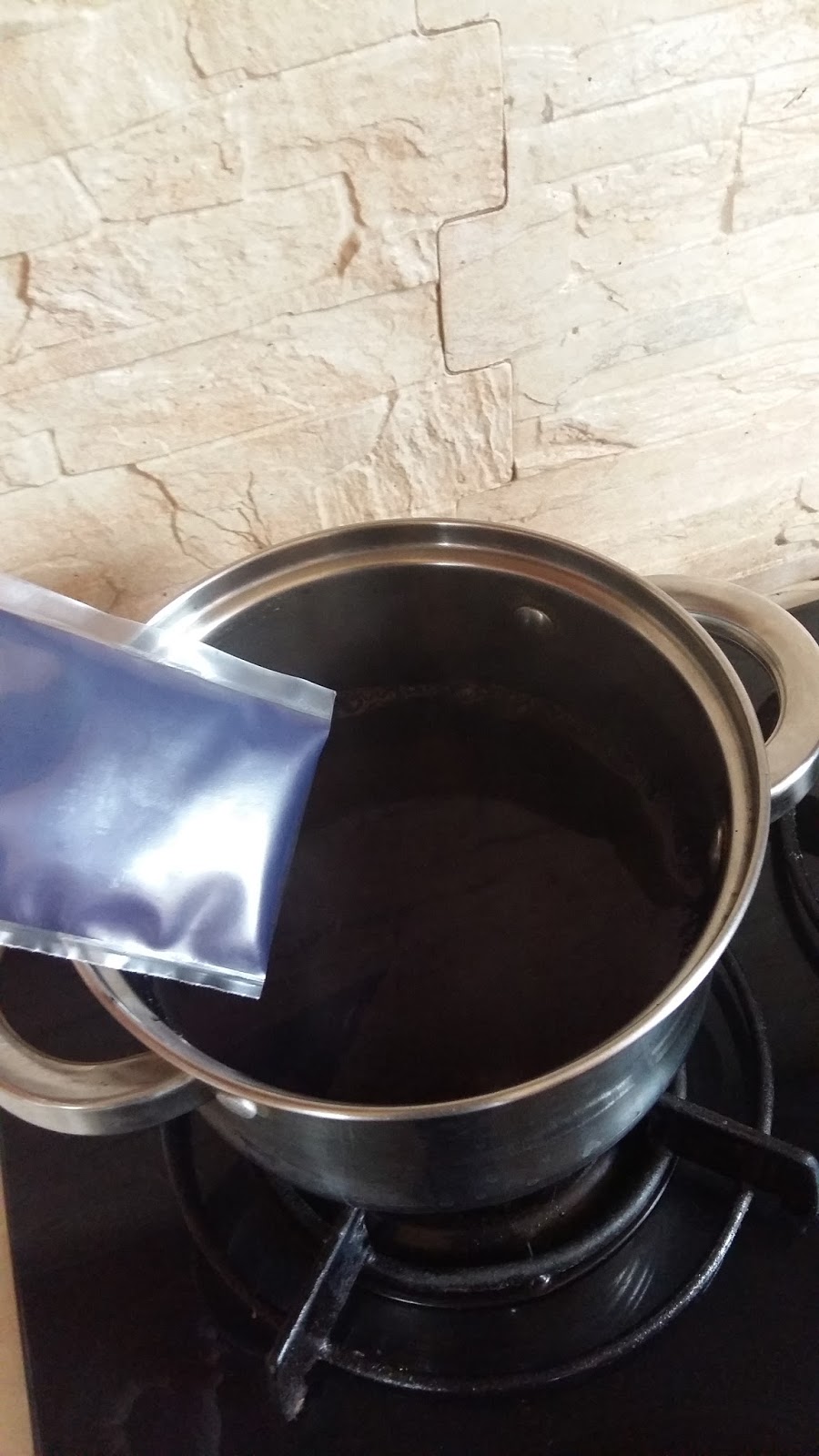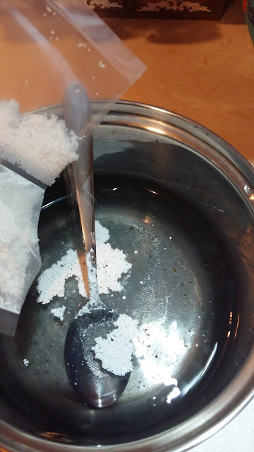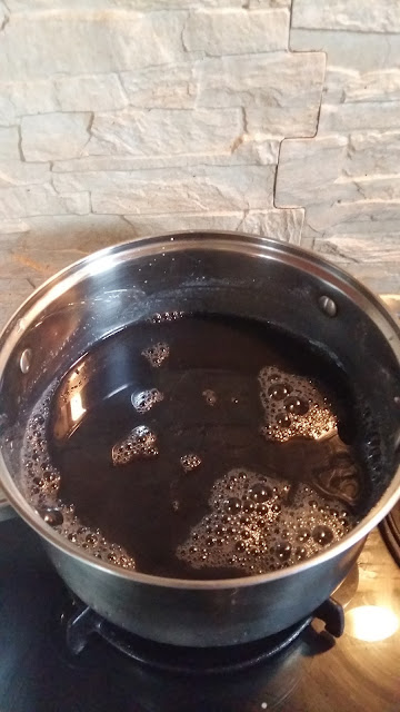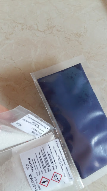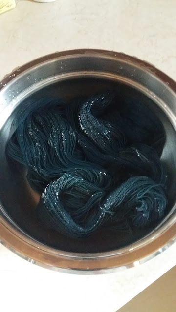 Tutaj właśnie popełniłam ten błąd, o którym wspominałam wcześniej, tak mi się przynajmniej wydaje. Ponieważ nie znam włoskiego, a instrukcja jest właśnie w takim języku, wydedukowałam, że proszek indygo powinno się najpierw wymieszać z wapnem, a następnie rozpuścić w wodzie i tak powstałą pastę wymieszać z woda i dodać cukier. W sumie to też nie jestem pewna czy taka kolejność miała jakieś znaczenie i ten mój błąd był faktycznie błędem, no ale cóż, już się tego nie dowiem, chyba że postanowię zrobić jeszcze jedno indygo... ;-) Tak czy inaczej powstał barwnik, który poddałam dalszej obróbce cieplnej.
