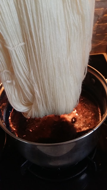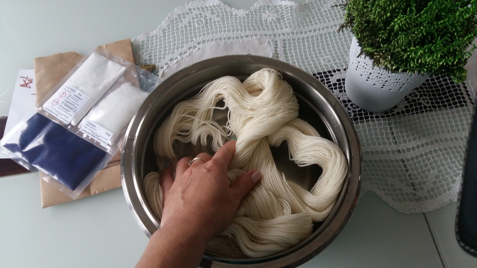 Wilgotną włóczkę, powoli włożyłam do podgrzanego barwnika. Zrobiłam to dosłownie na chwilkę, może jakieś 15 sekund i wyjęłam. Odczekałam kilka sekund, trzymając wełnę cały czas nad garnkiem, i dla pewności, wszak ja niedoświadczona jestem, zanurzyłam wełnę jeszcze raz i wyjęłam.
