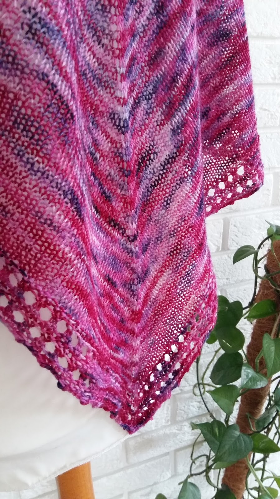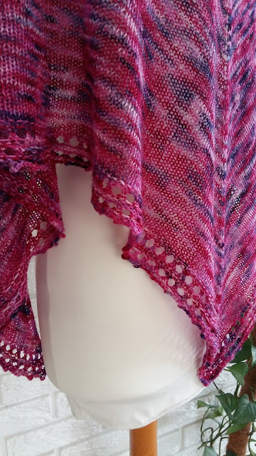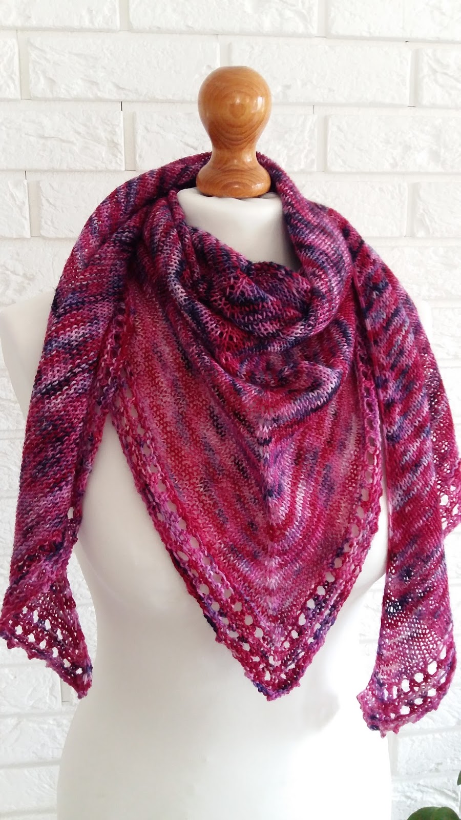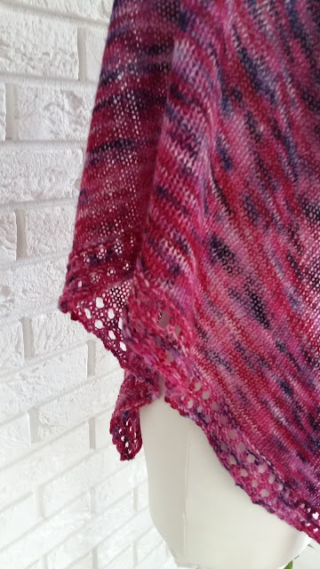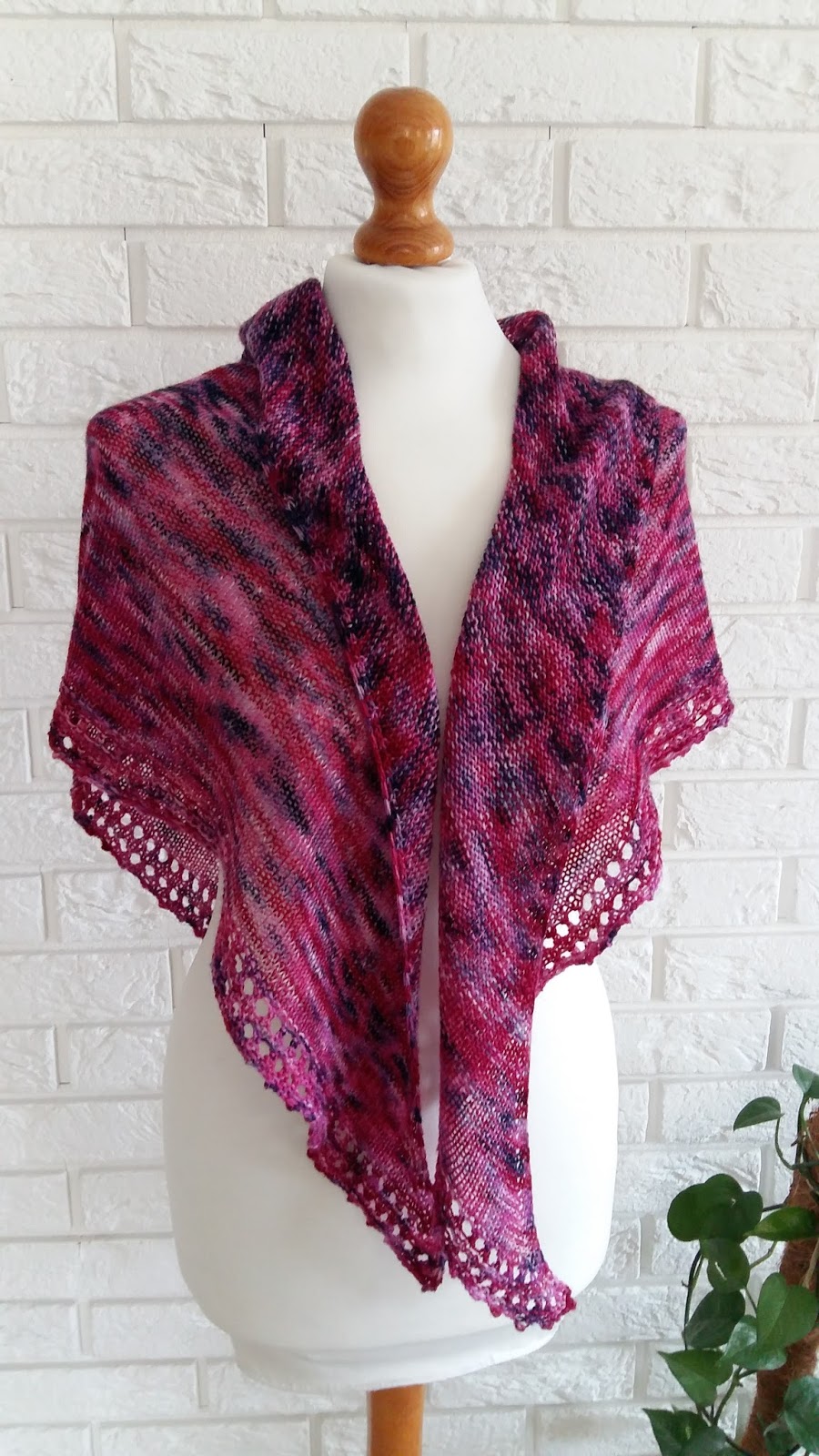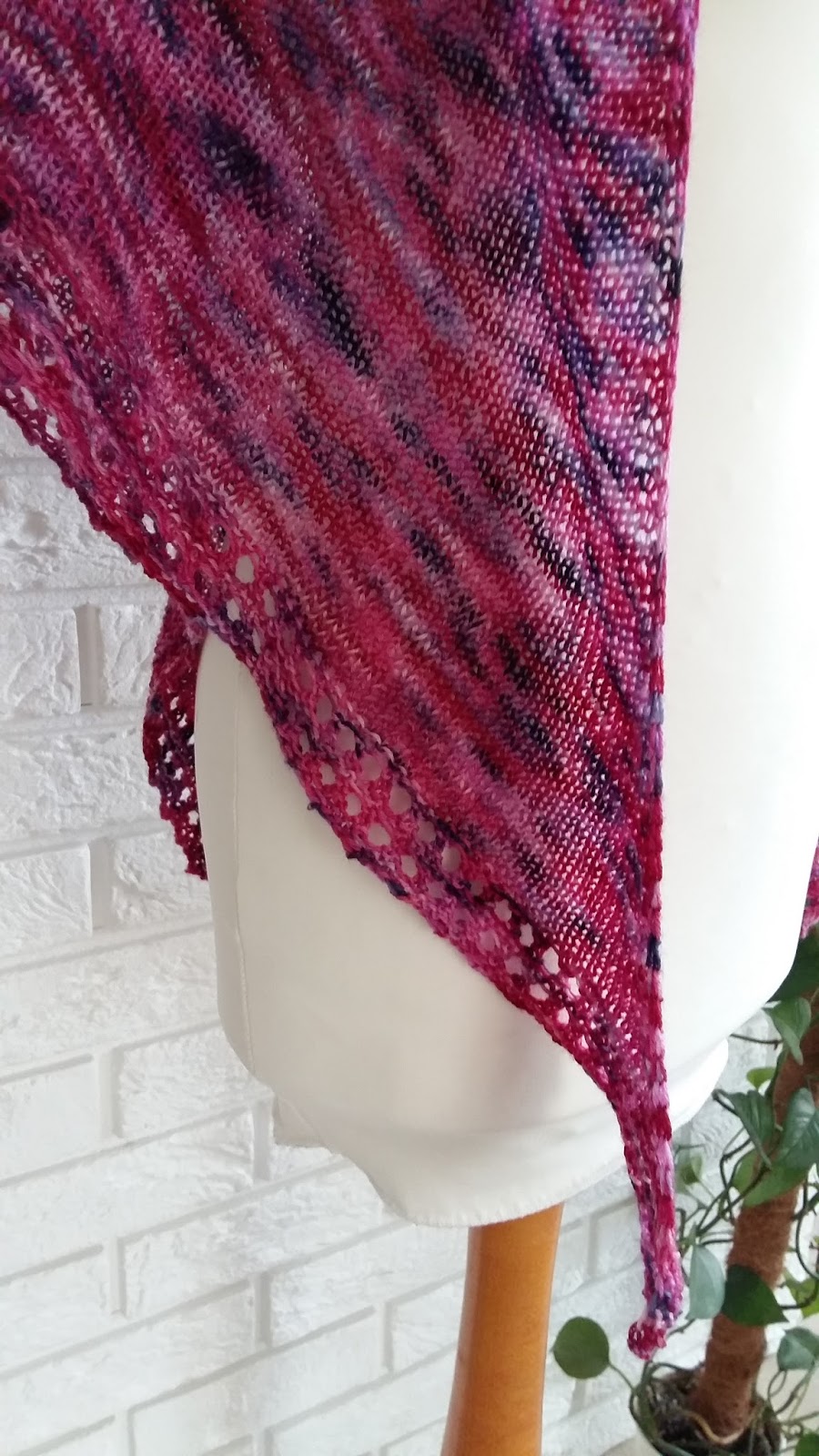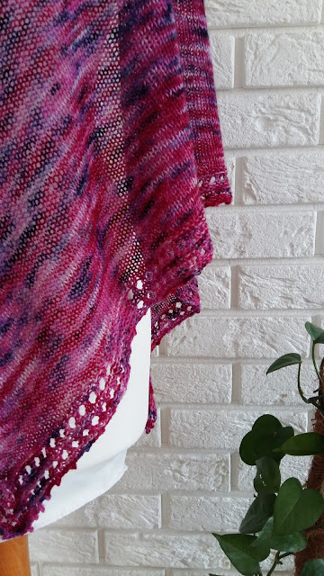 ... ostatnio powstała u mnie bardzo prosta chusta. Gładki ścieg, czyli jersey i tylko dwa rzędy w ażurki na brzegach robótki.