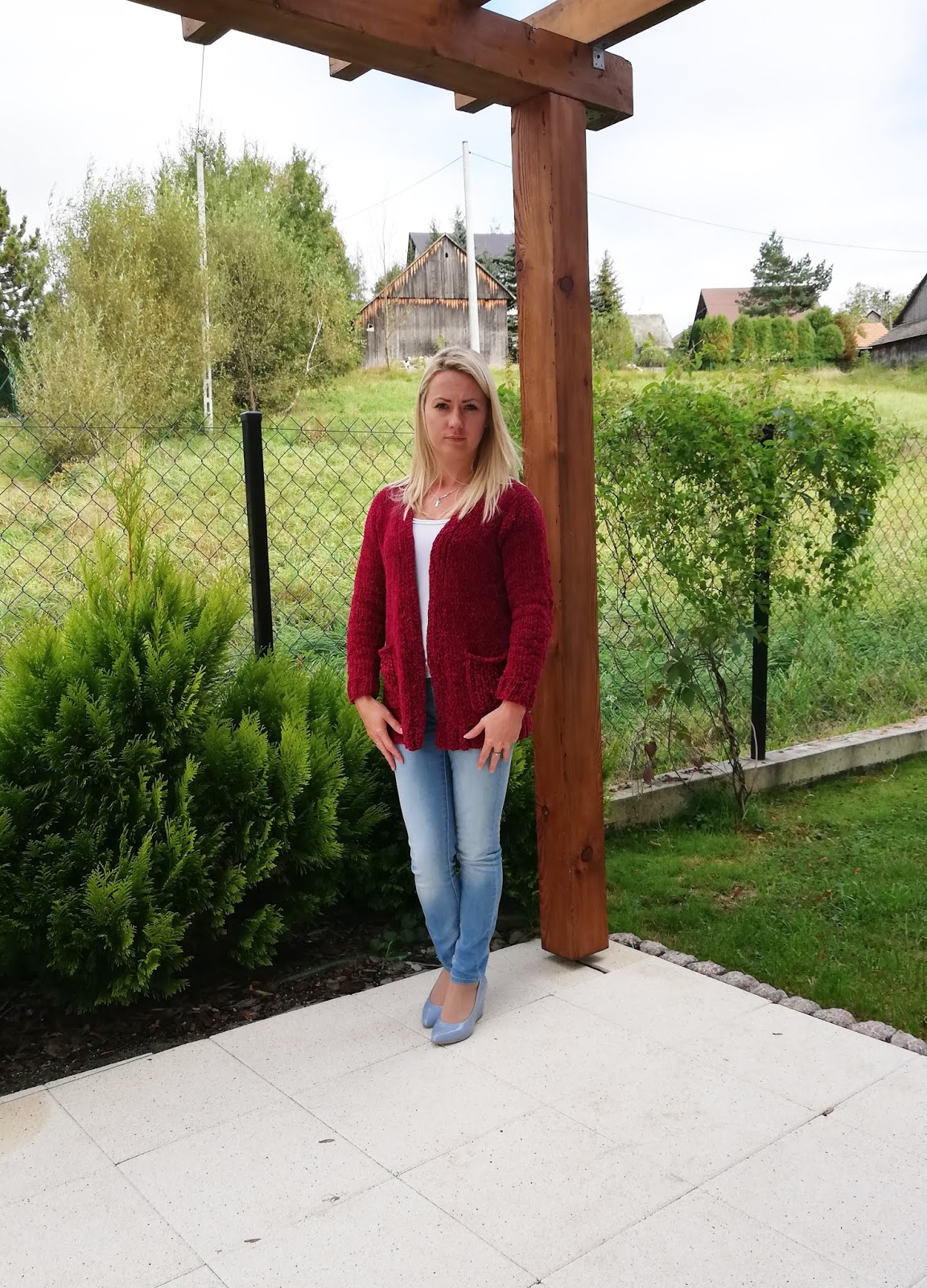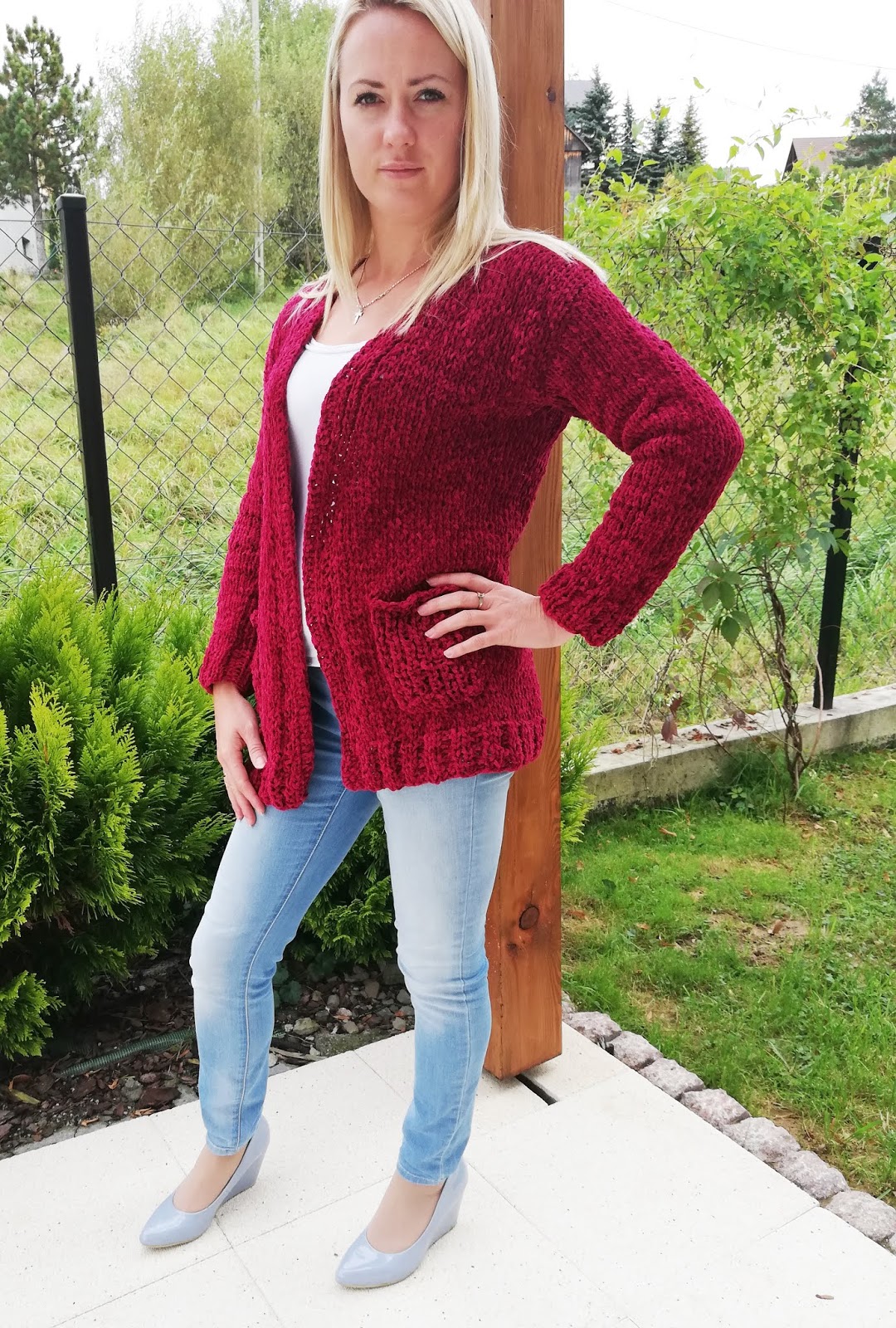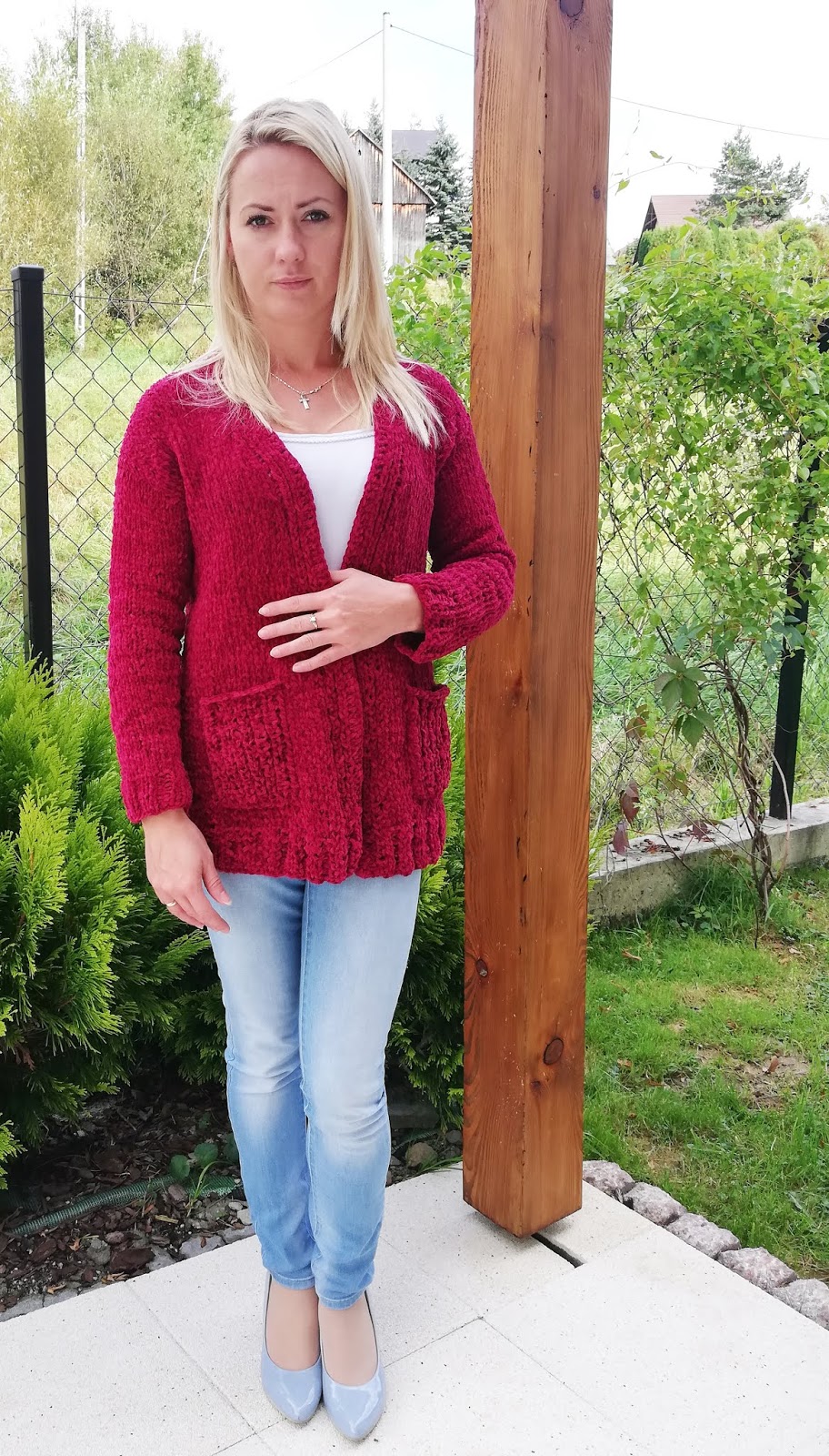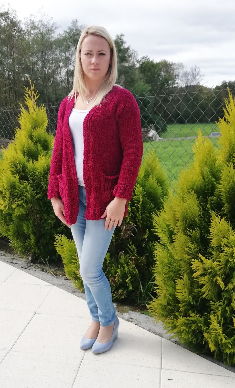 Pierwszy w tym sezonie, skończony sweter to piękny i cieplutki kardigan w kolorze wina.