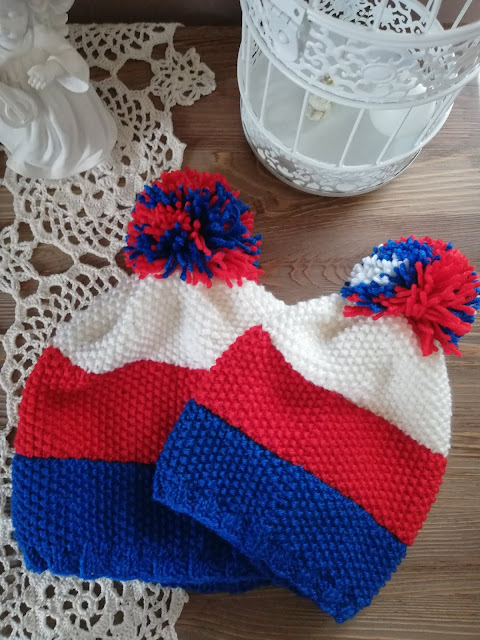 Na koniec czapkowej wędrówki chciałam Wam pokazać, równie szybki projekt, mianowicie dwie czapki kibica... Klubowe kolory zostały wybrane z włóczek Peo 30. Bardzo fajna wełna, z dobrze skręconą nitką. W 50 gramowym motku jest 100 metrów. Ja dziergałam na drutach 3,25 mm, żeby czapka była cieplejsza, nie miała dużych prześwitów... Z tych trzech motków powstały dwie czapki dla 3 latka i dla rocznego chłopca.