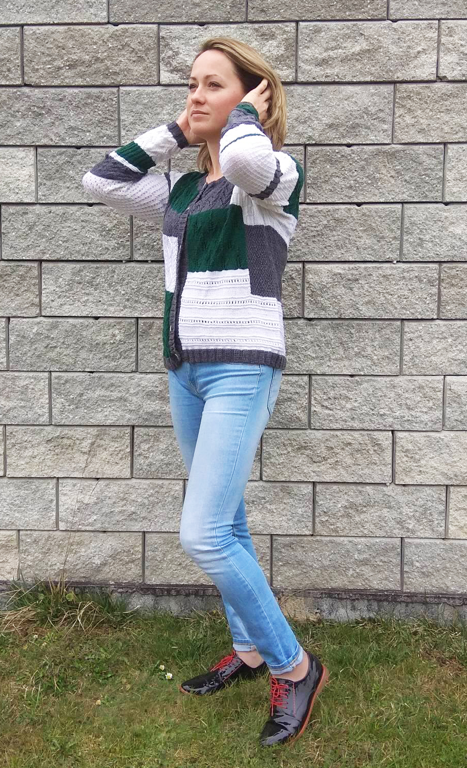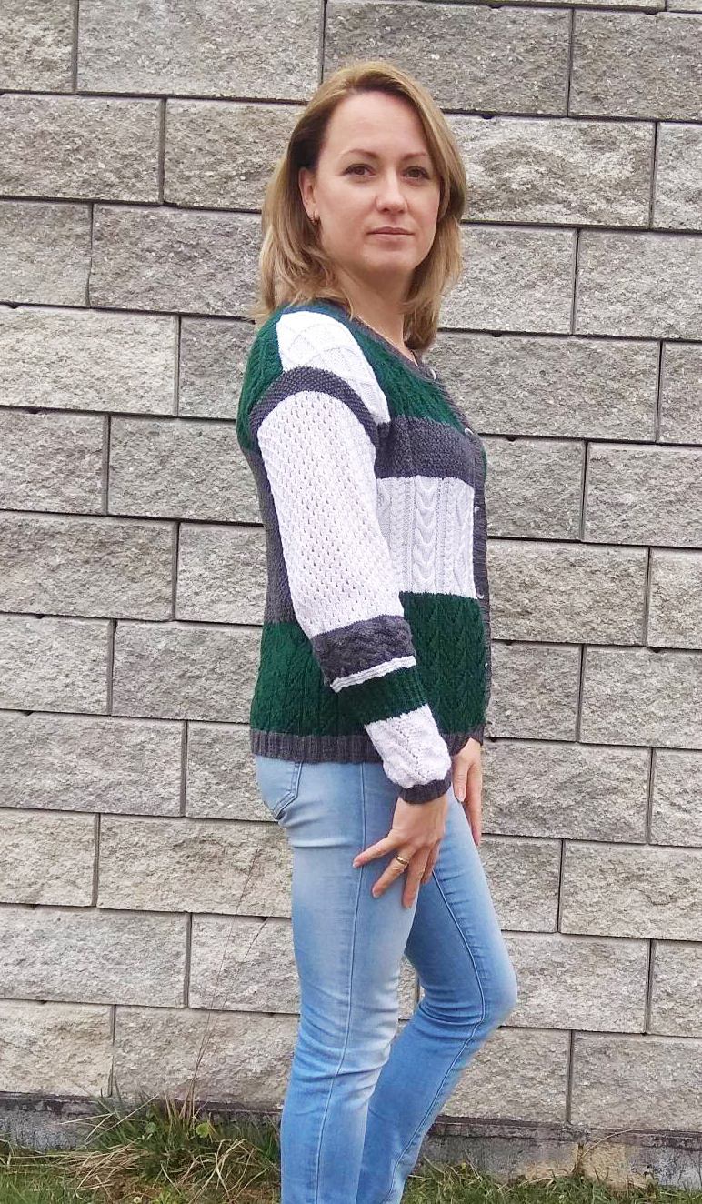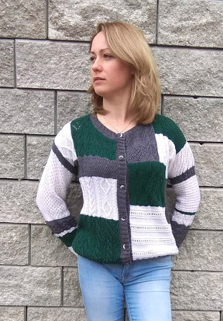 Wiedziałam, że jest to wymagający przeciwnik ale nie zdawałam sobie sprawy, że aż tak... Wymyślanie wzorów na początku było całkiem fajne ale z biegiem pracy, brakowało pomysłów na kolejne. Musiałam tak planować dzierganie aby wzory w poszczególnych obszarach różniły się nieco od siebie i dobierać tak kolory aby było ciekawie, nie za dużo, nie za mało, a z racji tego, że jestem osobą oszczędną, to chciałam jeszcze do końca wykorzystać te motki, które miałam przeznaczone na ten sweterek, nie mniej nie więcej. W sumie wyszło po 3 motki zielonego i białego i 4 motki szarego.