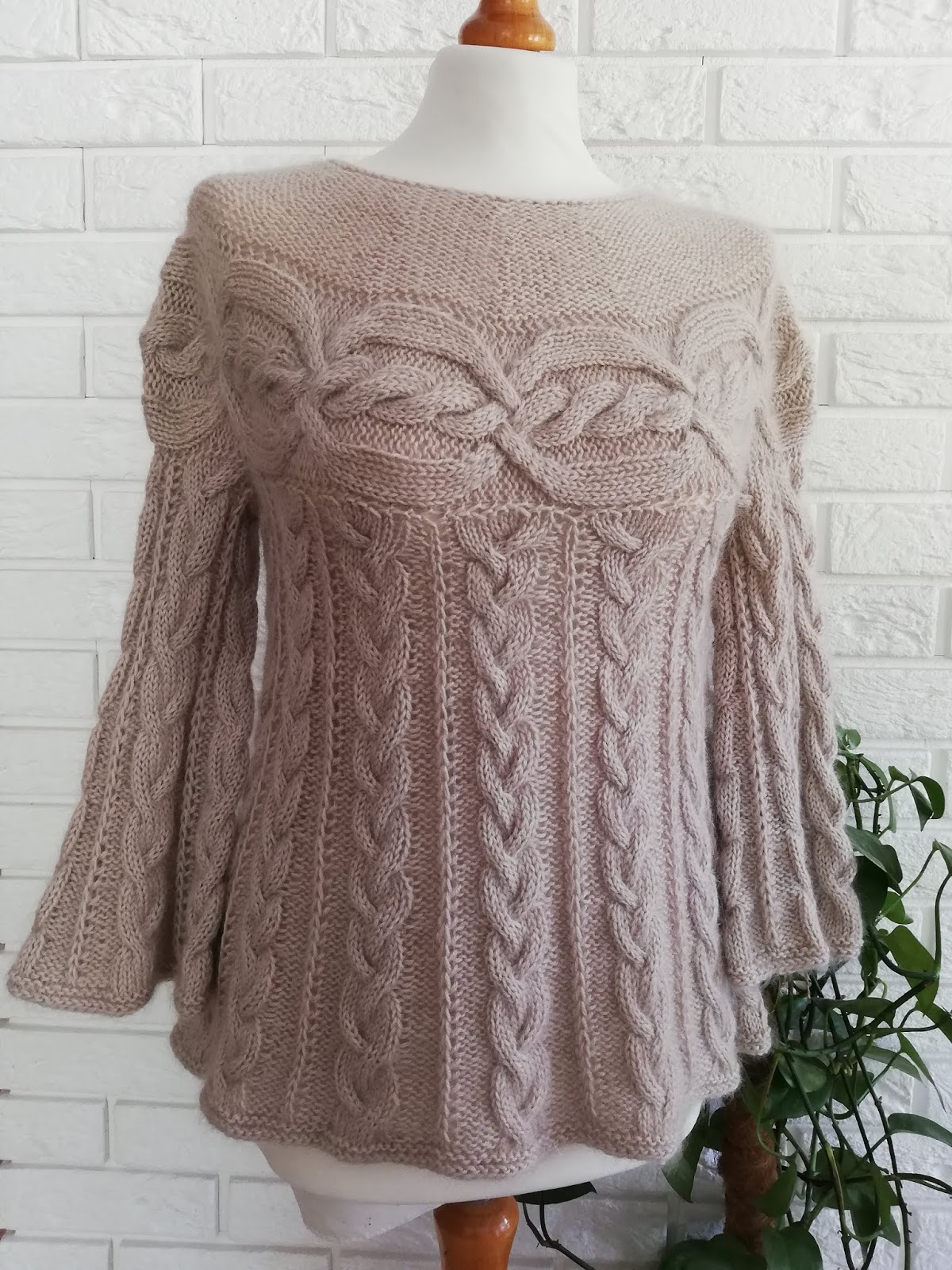 Kolejnym etapem było zrobienie części nad plecionką czyli dekolt, a następnie nabrałam oczka na część dolną i rękawy.