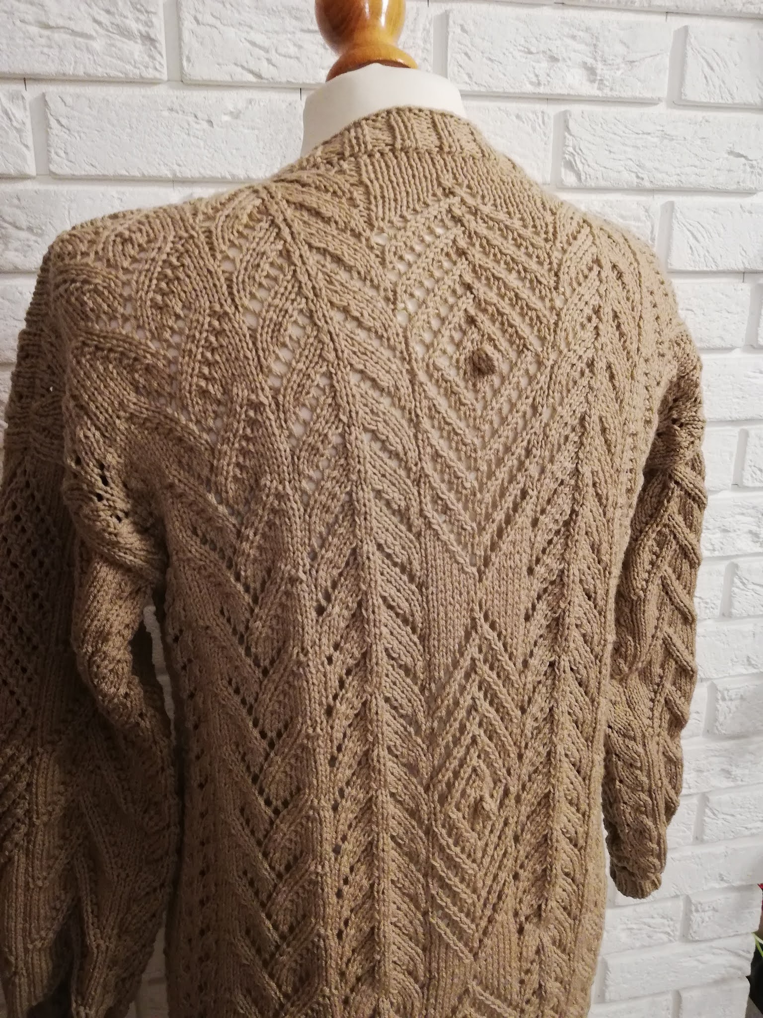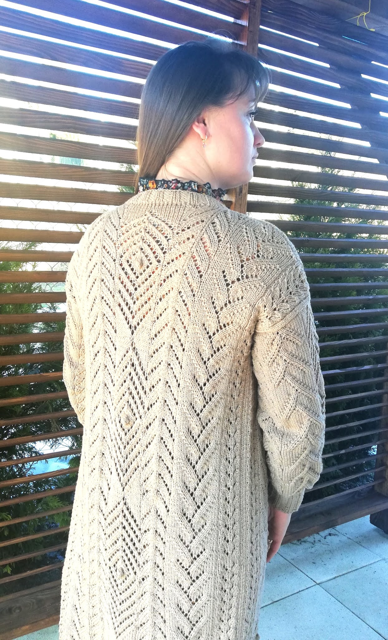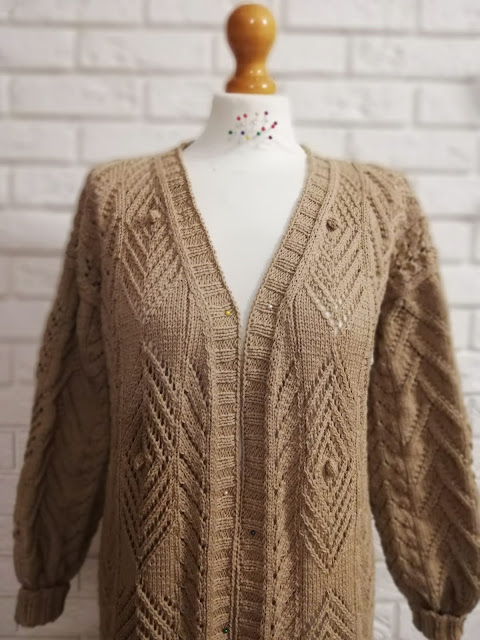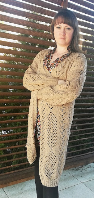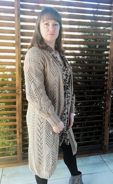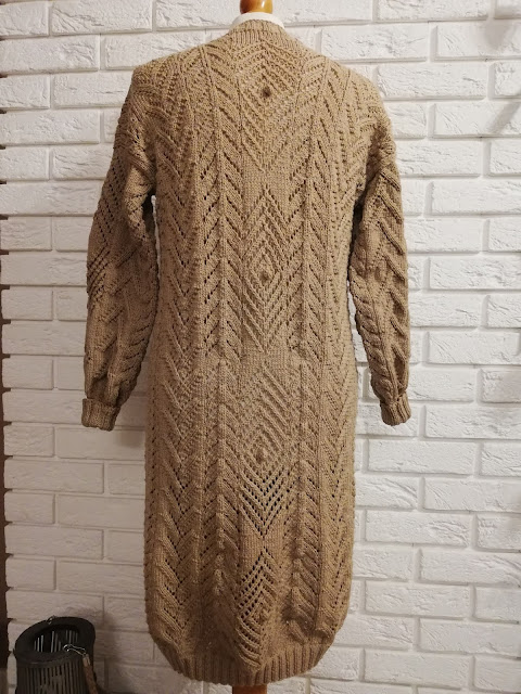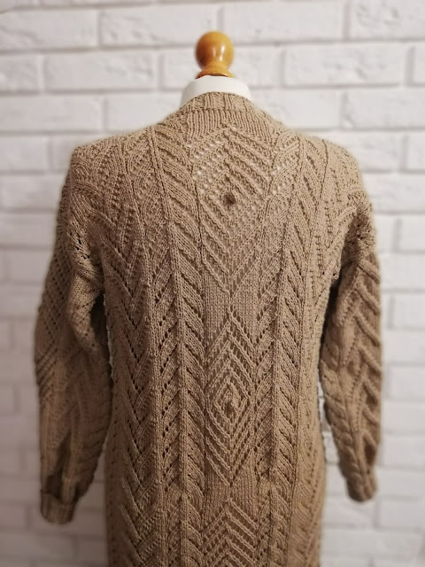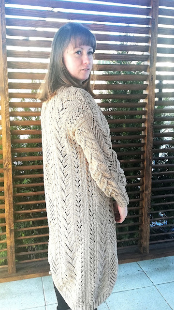 Gdy włóczka już była wybrana, to myślałam nad częścią garderoby jaką mogłabym sobie wydziergać. Od razu przyszedł mi do głowy kardigan, ale taki długi i cały we wzory. Ze względu nad ogromną ilością oczek do przerobienia na okrągło, stwierdziłam, że dobrze będzie i dla mnie i dla swetra gdy zrobię go z części. Mniej do dziergania na raz i dzianina będzie po bokach bardziej stabilna. Wzory znalazłam w książce dziewiarskiej i je połączyłam. Przeliczyłam ilość oczek na poszczególne wzory i dopasowałam je symetrycznie aby ładnie to wyglądało zwłaszcza na plecach.