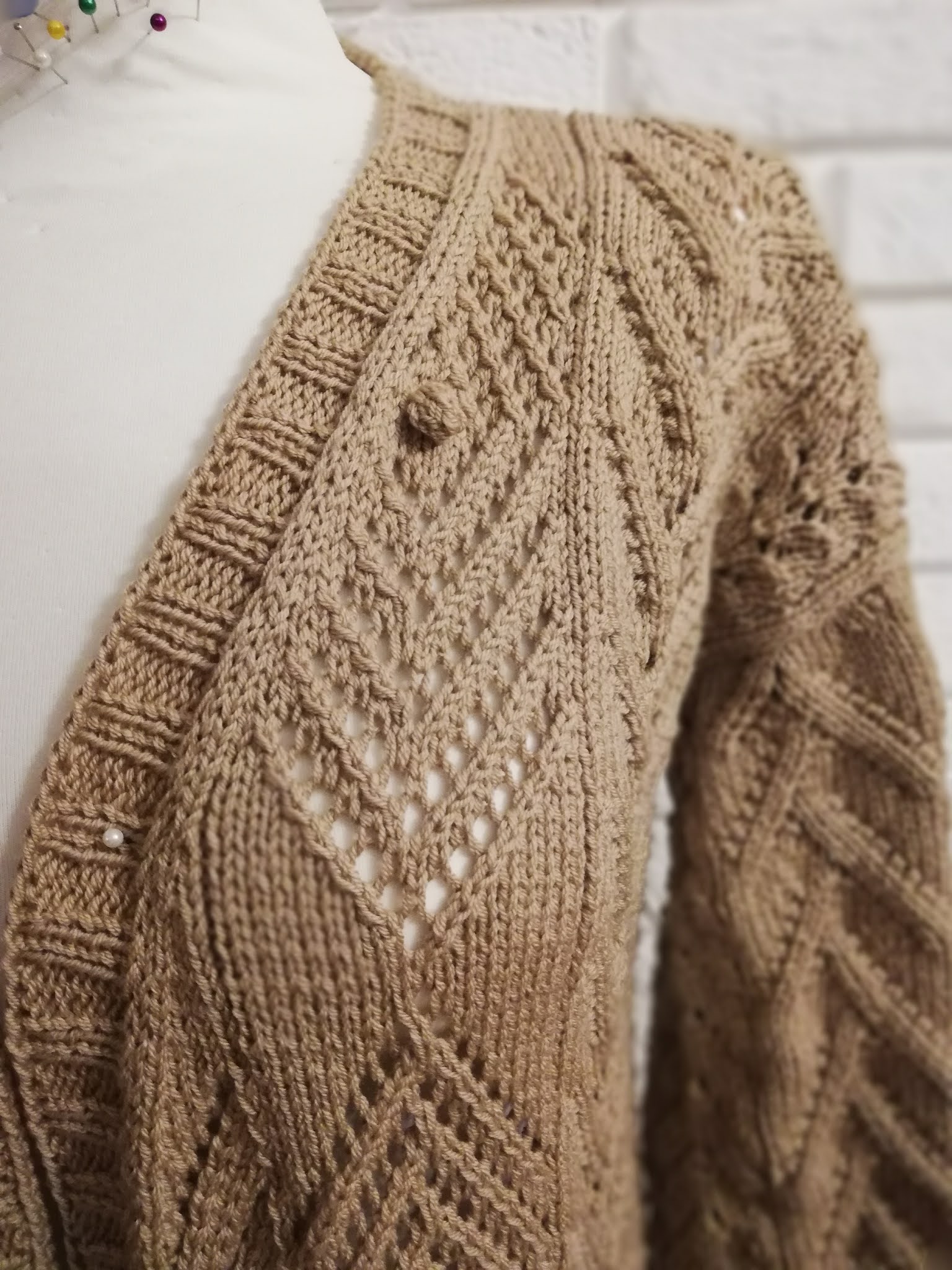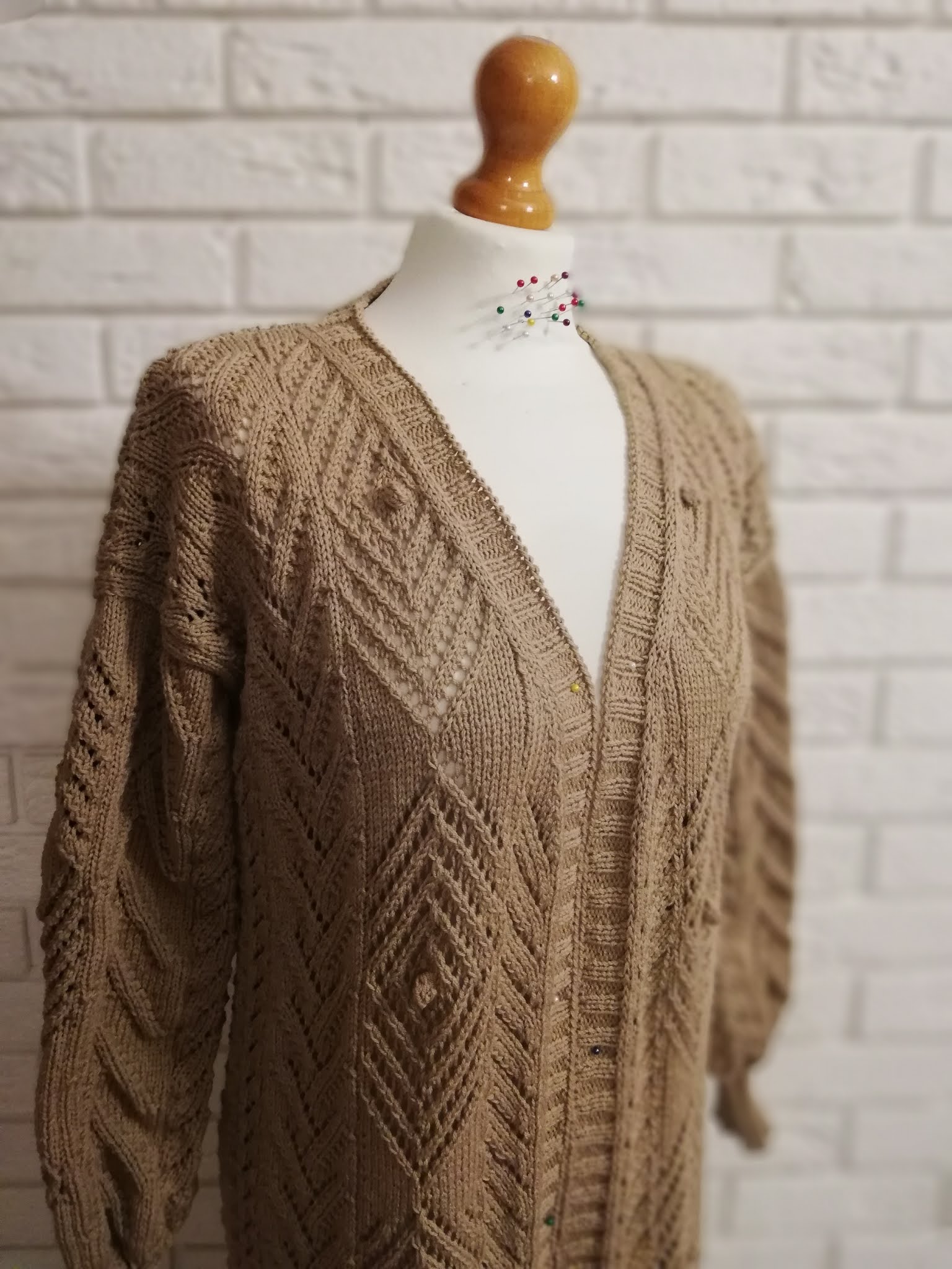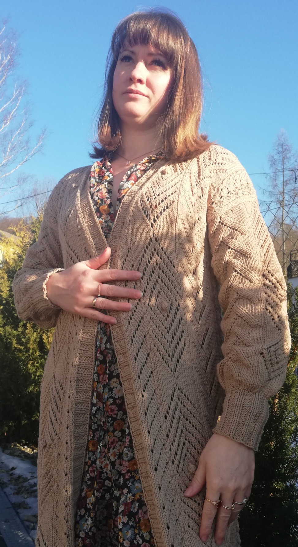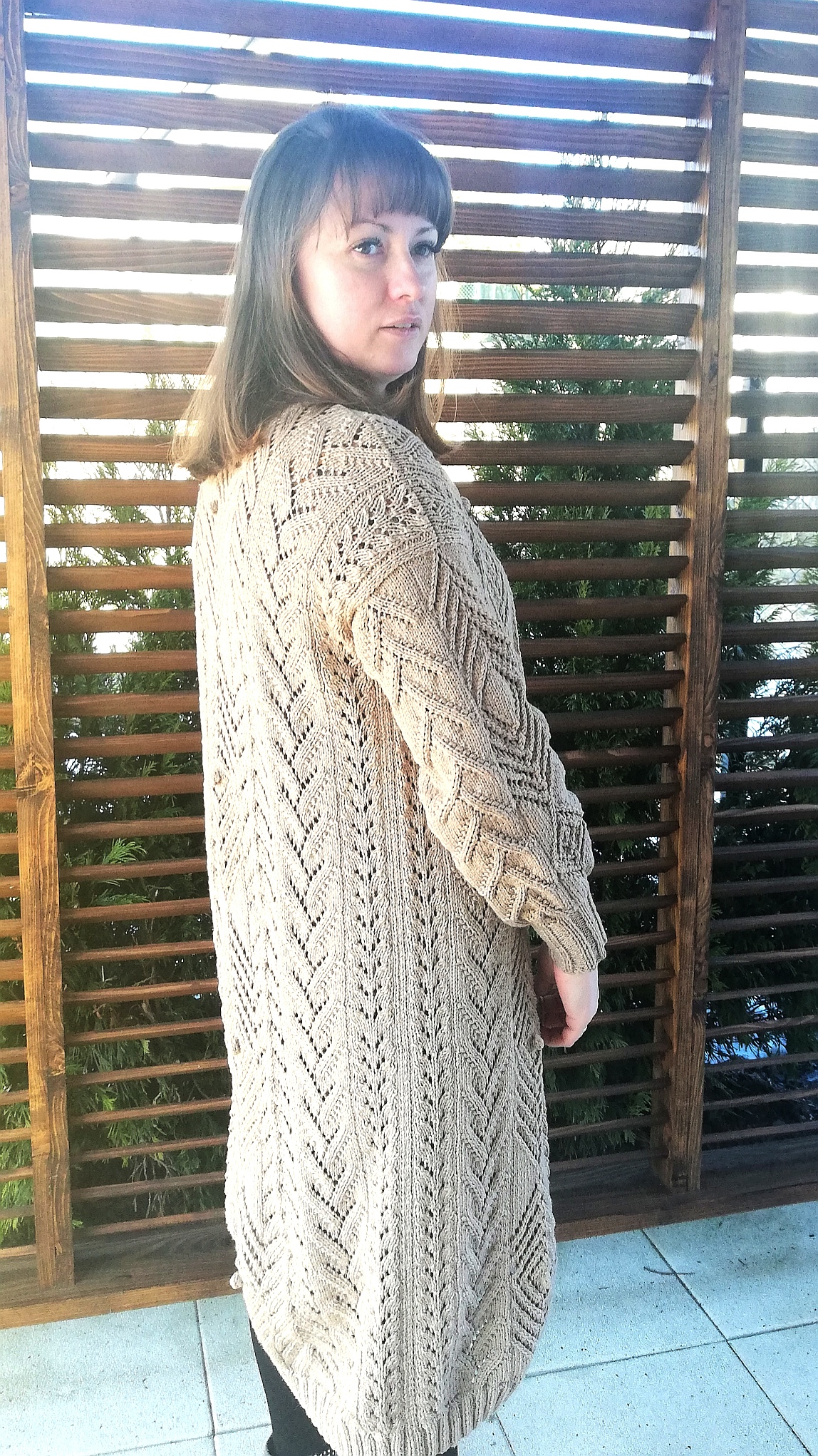 Gdy włóczka już była wybrana, to myślałam nad częścią garderoby jaką mogłabym sobie wydziergać. Od razu przyszedł mi do głowy kardigan, ale taki długi i cały we wzory. Ze względu nad ogromną ilością oczek do przerobienia na okrągło, stwierdziłam, że dobrze będzie i dla mnie i dla swetra gdy zrobię go z części. Mniej do dziergania na raz i dzianina będzie po bokach bardziej stabilna. Wzory znalazłam w książce dziewiarskiej i je połączyłam. Przeliczyłam ilość oczek na poszczególne wzory i dopasowałam je symetrycznie aby ładnie to wyglądało zwłaszcza na plecach.