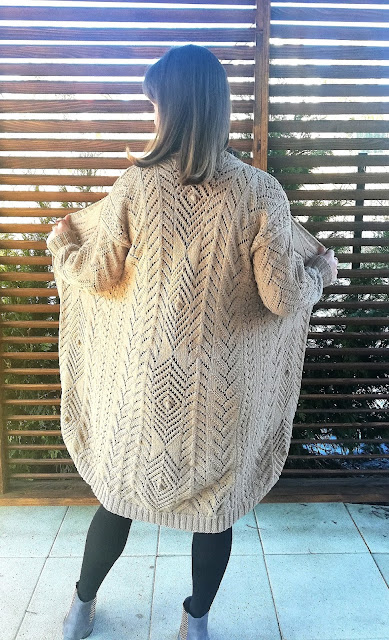 Druty to 4,5 mm, a na cały projekt zużyłam 16 motków. Choć sweter jest obszerny to dosyć szybko przybywało dzianiny. Podwójna nitka sprawiła, że sweter jest mięsisty, przyjemny i bardzo ciepły.
